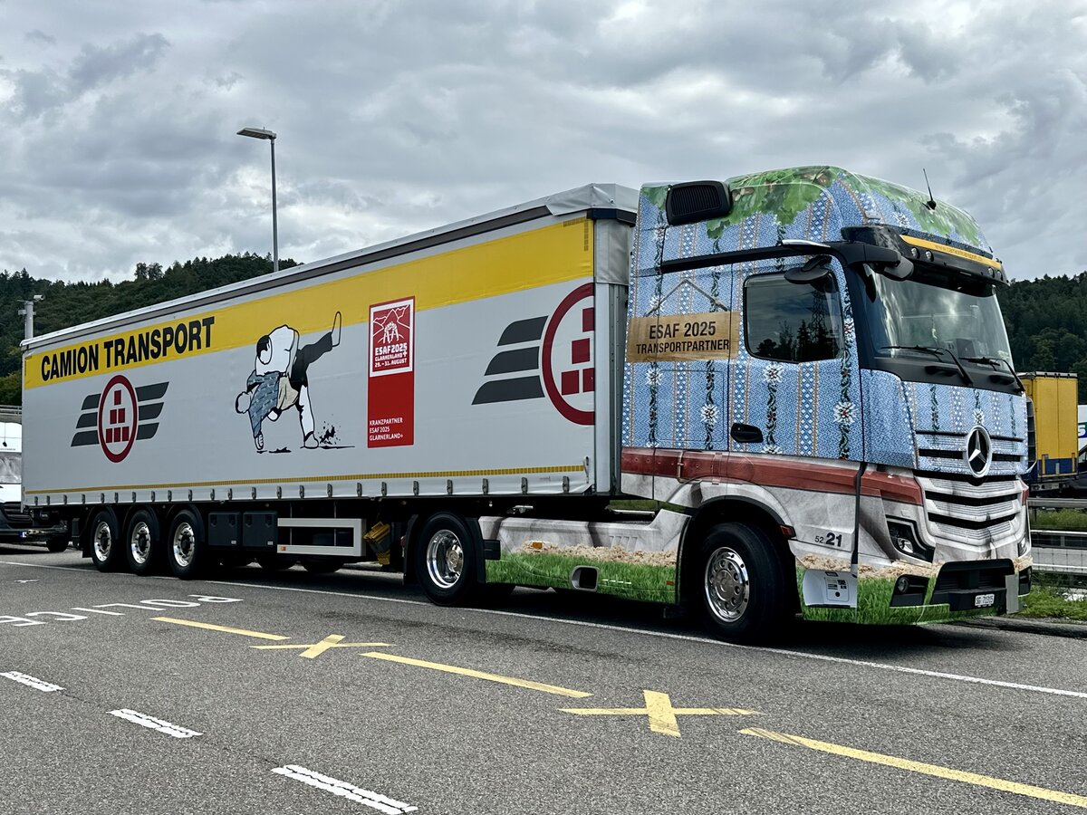 Der MB Actros Sattelzug von Camion Transport mit einem Schwinger Design fürs ESAF das in Mollis stattgefunden hat, am 4.9.25 auf der Rastsätte Grauholz.