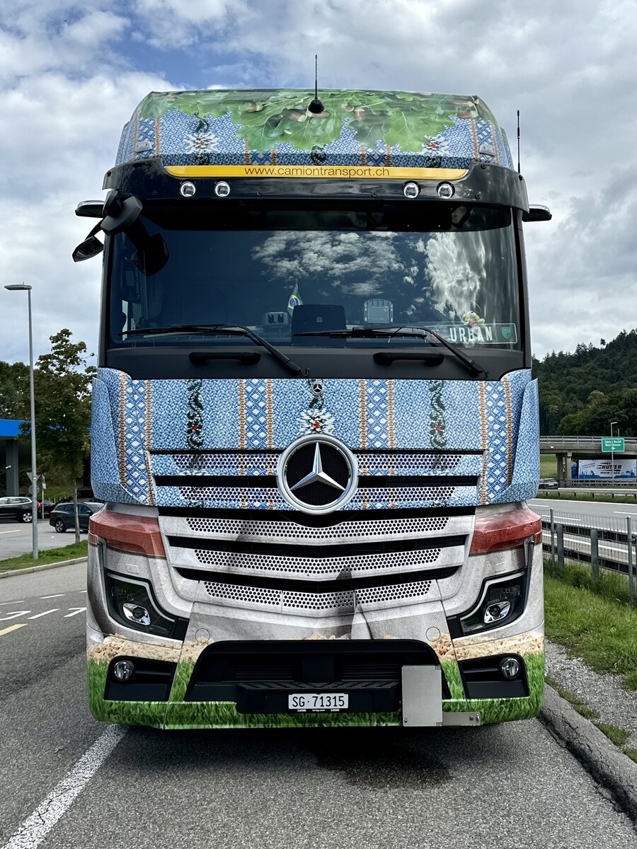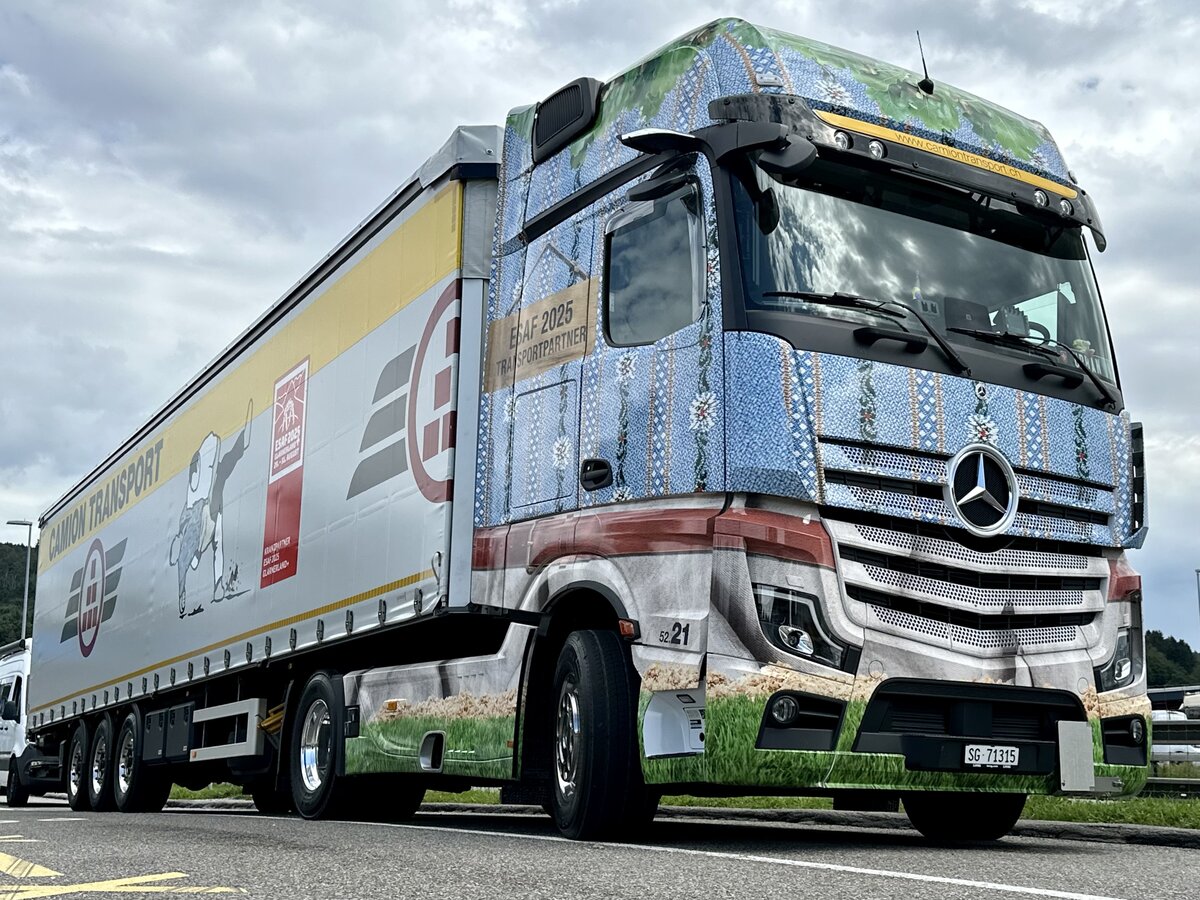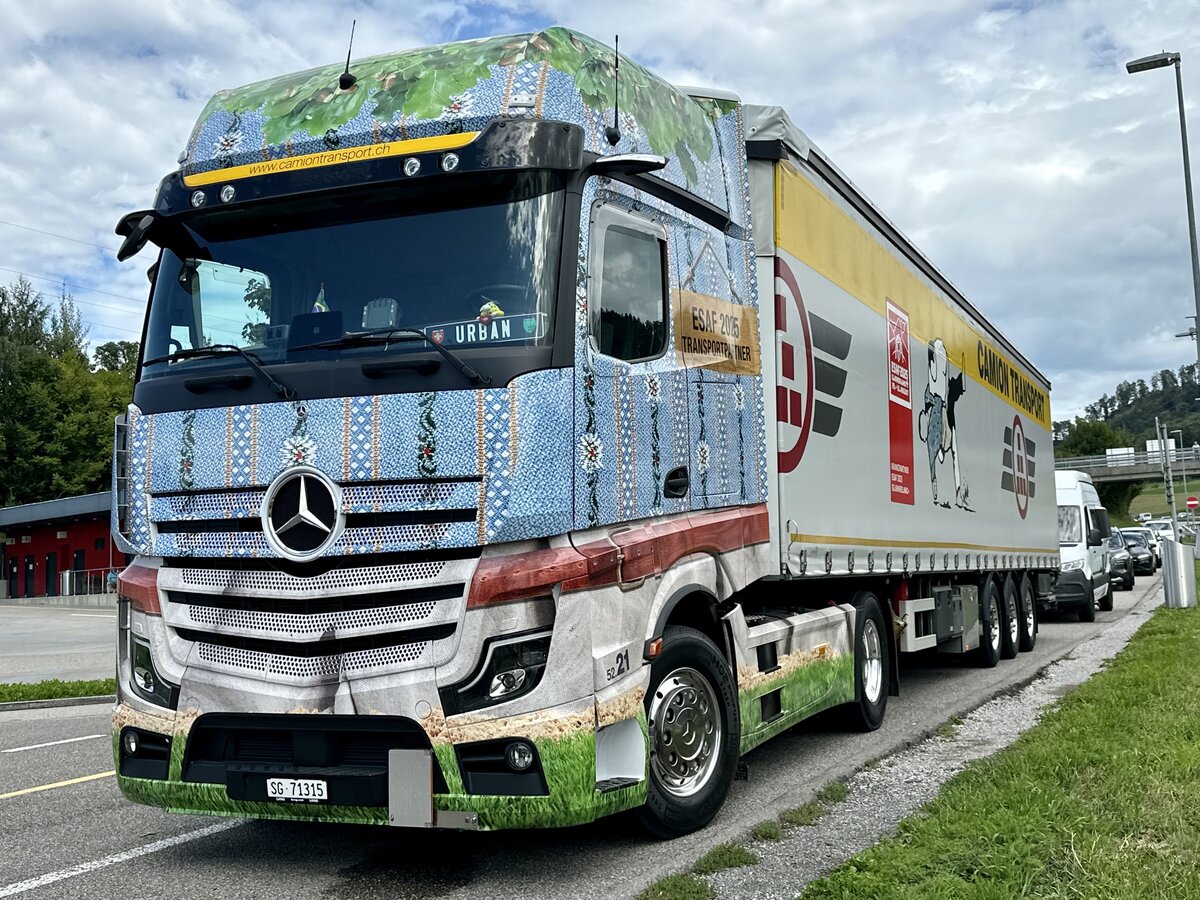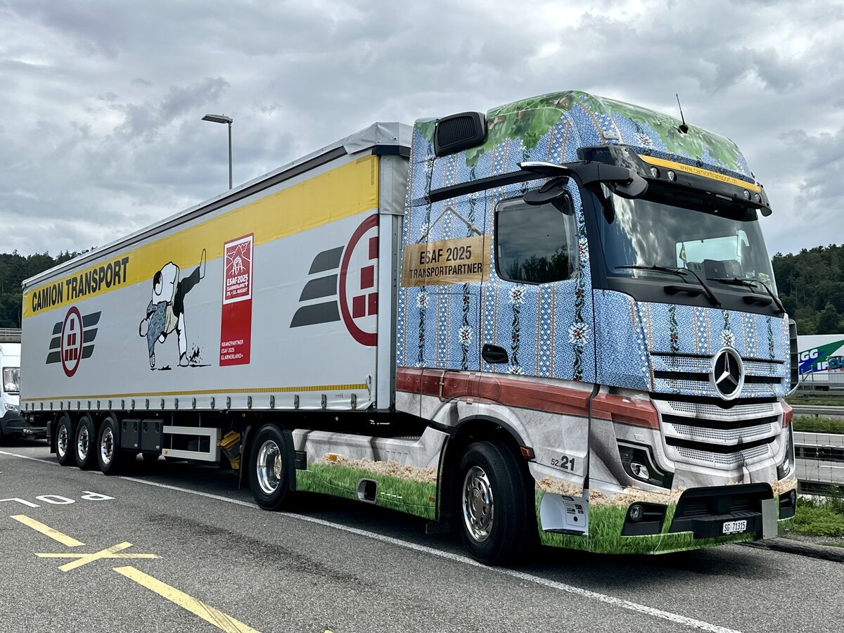 Der MB Actros Sattelzug von Camion Transport im Schwinger Design fürs ESAF das in Mollins stattfand, am 4.9.25 auf der Rastsätte Grauholz.