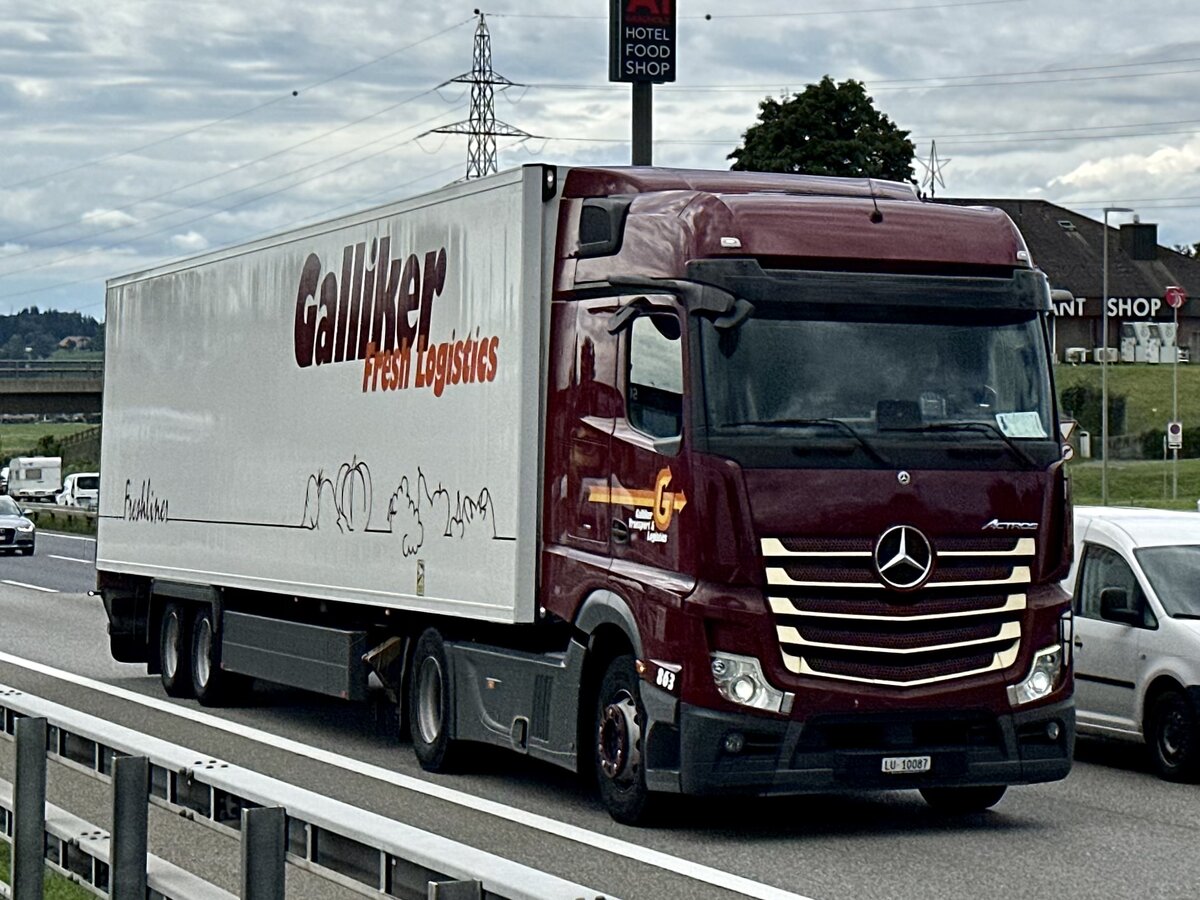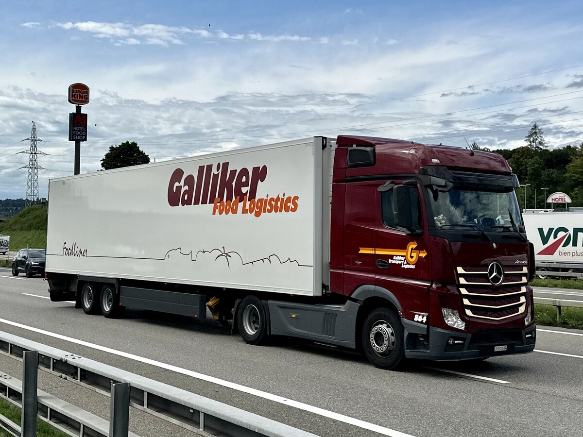 Ein MB Actros Sattelzug von Galliker am 4.9.25 bei der Raststätte Grauholz.