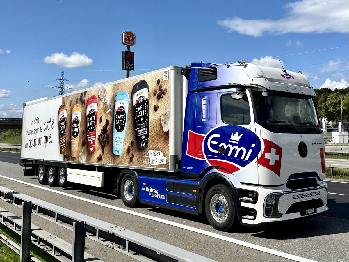 Ein MB eActros 600 Sattelzug von Emmi am 5.9.25 beim Grauholz.