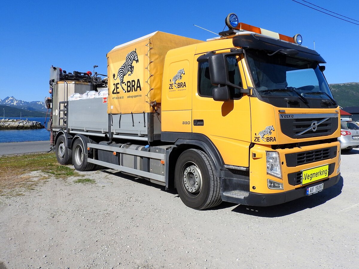 VOLVO FM330 der norwegischen ZEBRA-Strassenmarkierung hat schon Feierabend; 250717