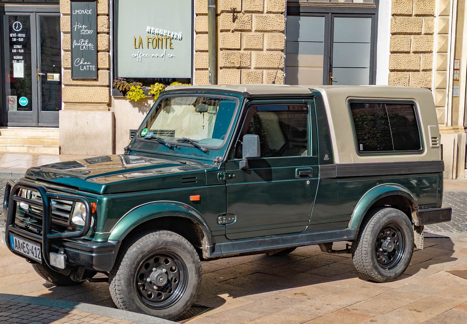 Dunkelgrüner Suzuki Samurai Santana, gesehen in August, 2025.