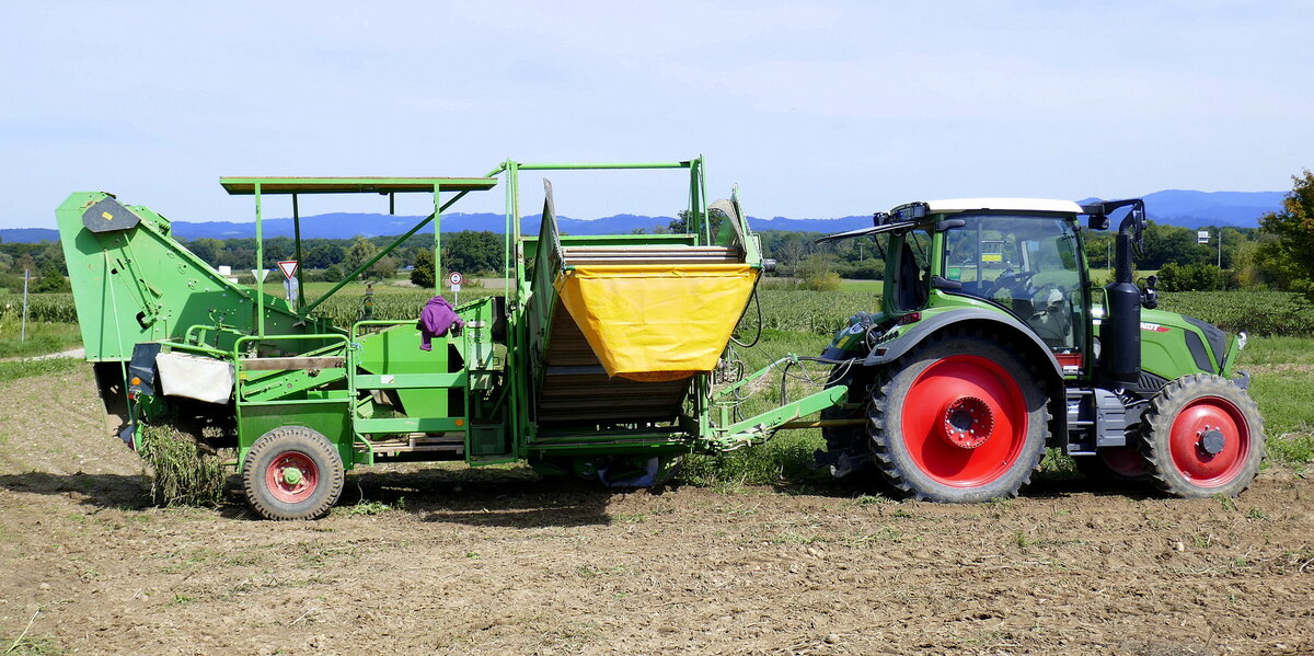 Grimme, Kartoffelvollerntemaschine gezogen und angetrieben von einem Fendt-Allradschlepper, beim Ernteeinsatz im Breisgau, Sept.2025