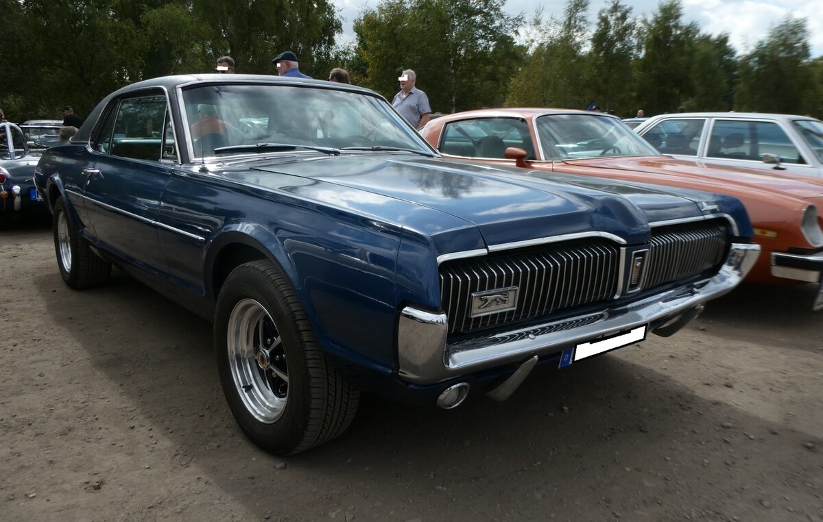Mercury Cougar X7 aus dem Jahr 1968. Der 1964 vorgestellte Ford Mustang war ein Verkaufserfolg, insbesondere bei den jungen Menschen der Nachkriegsgeneration. Um auch älteren Kunden einen sportlichen, aber auch luxuriöseren Wagen an die Hand geben zu können, brachte die Ford-Tochter Mercury 1967 den "Cougar" auf den Markt. Der "Cougar" ist nach einem nordamerikanischen Berglöwen benannt. Das luxuriöse Sport-Coupe war in drei Varianten erhältlich. Die gezeigte X7-Baureihe war das Toppmodell. Das Auto war grundsätzlich mit V8-Motoren in der Bandbreite von 4.7 Litern bis 7.0 Litern Hubraum ausgerüstet. 11. Oldtimertreffen des AMC Duisburg auf dem Parkplatz des Landschaftspark Duisburg Nord am 24.08.2025.