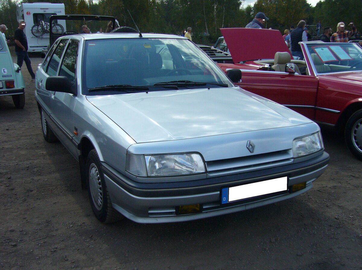 Renault R21 Schräghecklimousine im Farbton titane. Als Stufenhecklimousine und Kombimodell namens "Nevada" kam der Renault R21 im März 1986 auf den Markt. Zum Facelift der Baureihe im Jahr 1989 wurde die Modellpalette um die gezeigte Schräghecklimousine erweitert. Die komplette Modellreihe war mit verschiedenen Benzin- und Dieselmotoren, sowie in mehreren Ausstattungsversionen lieferbar. Basismotorisierung war ein Vierzylinderreihenmotor mit einem Hubraum von 1397 cm³ und einer Leistung von 69 PS., während die Turboversion 175 PS aus einem Hubraum von 1995 cm³ an die Vorderräder weiter gab. 11. Oldtimertreffen des AMC Duisburg auf dem Parkplatz des Landschaftspark Duisburg Nord am 24.08.2025.