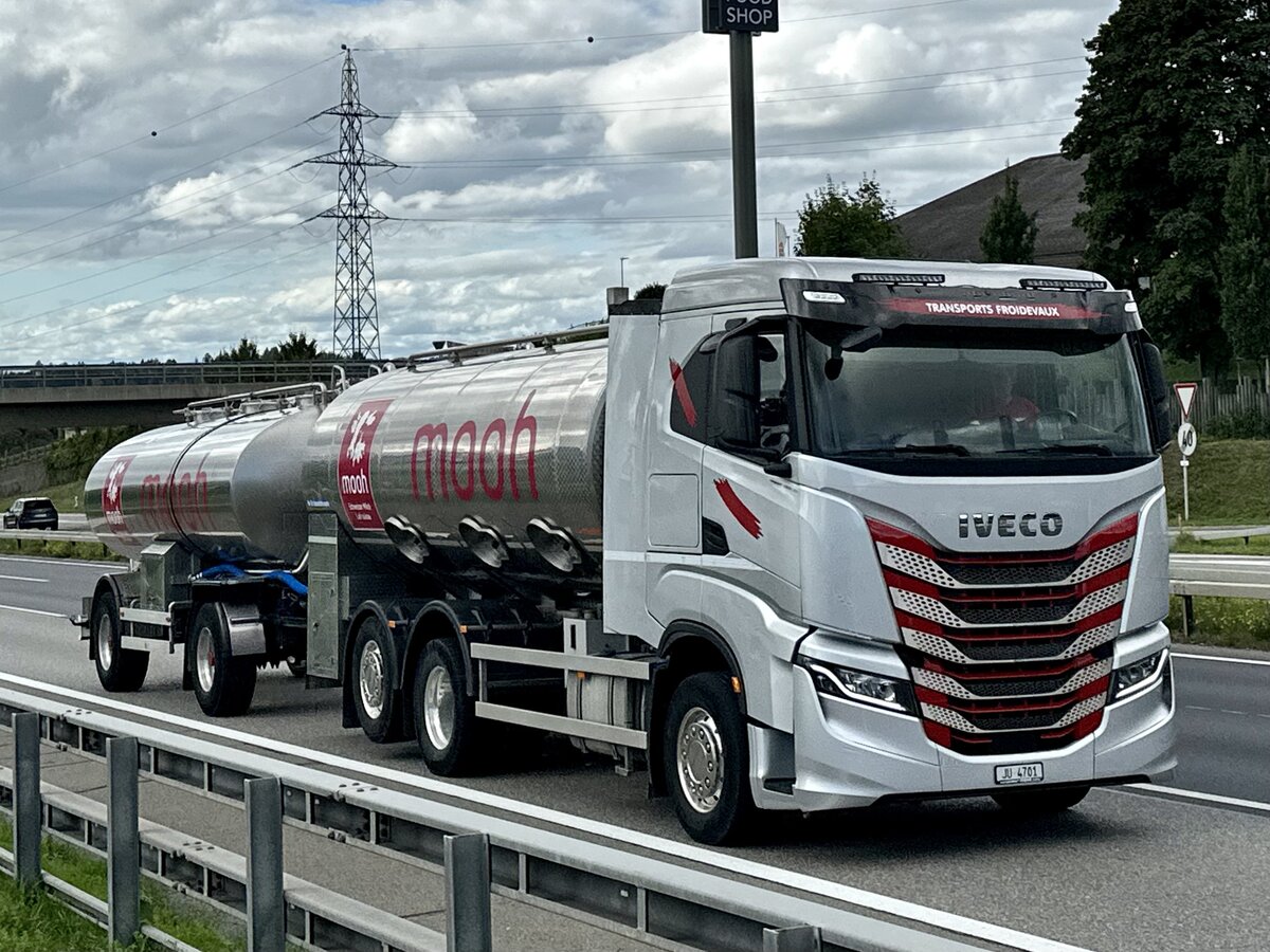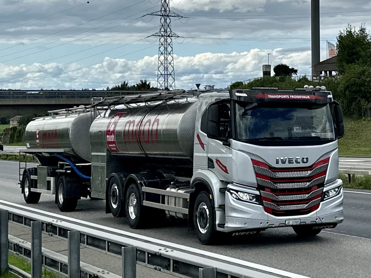 Ein Iveco Milchhängerzug von Transports Froidevaux am 11.9.25 beim Grauholz.