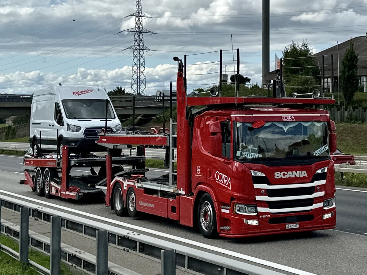 Ein Scania Autotransporter von Cotra am 11.9.25 beim Grauholz.
