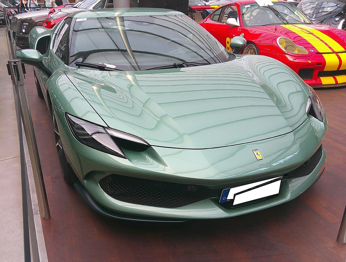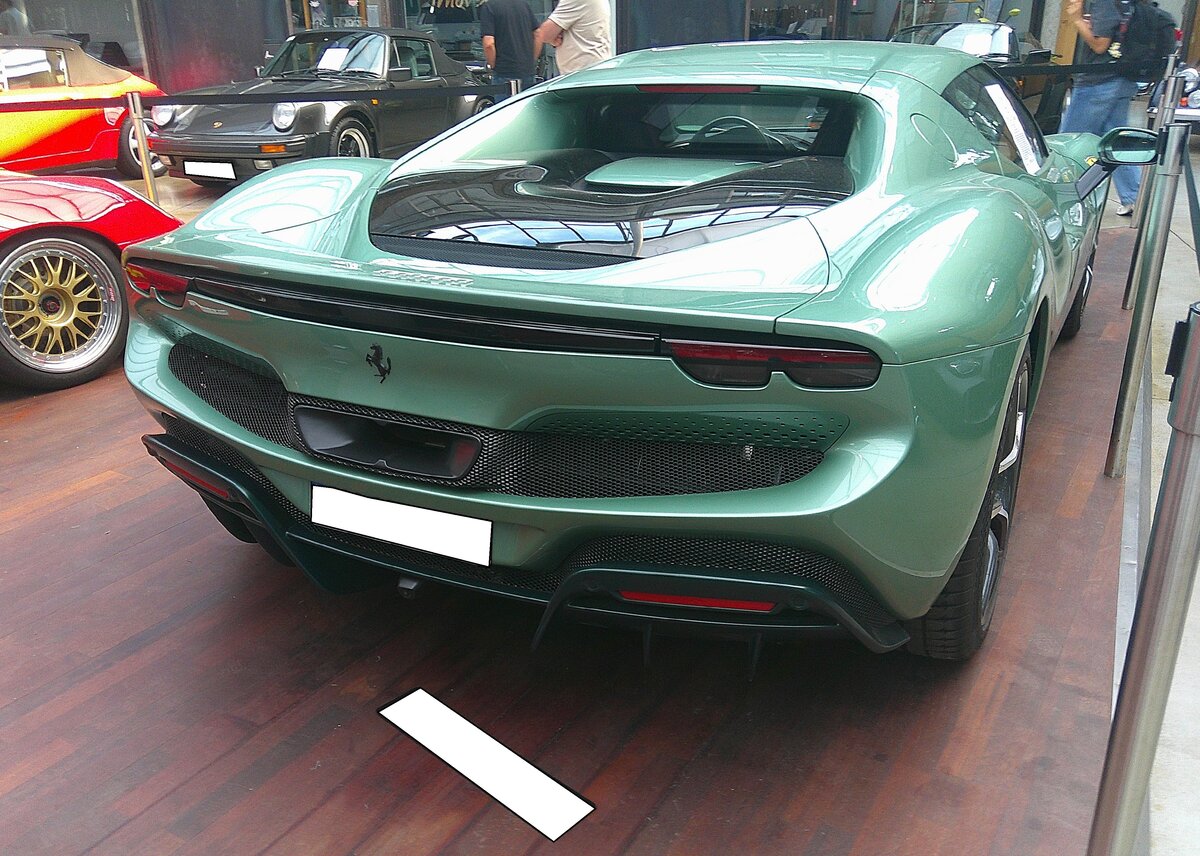 Heckansicht eines Ferrari 296GTB aus dem Jahr 2023 im Farbton glossy verde Francesca. Classic Remise Düsseldorf am 26.08.2025.