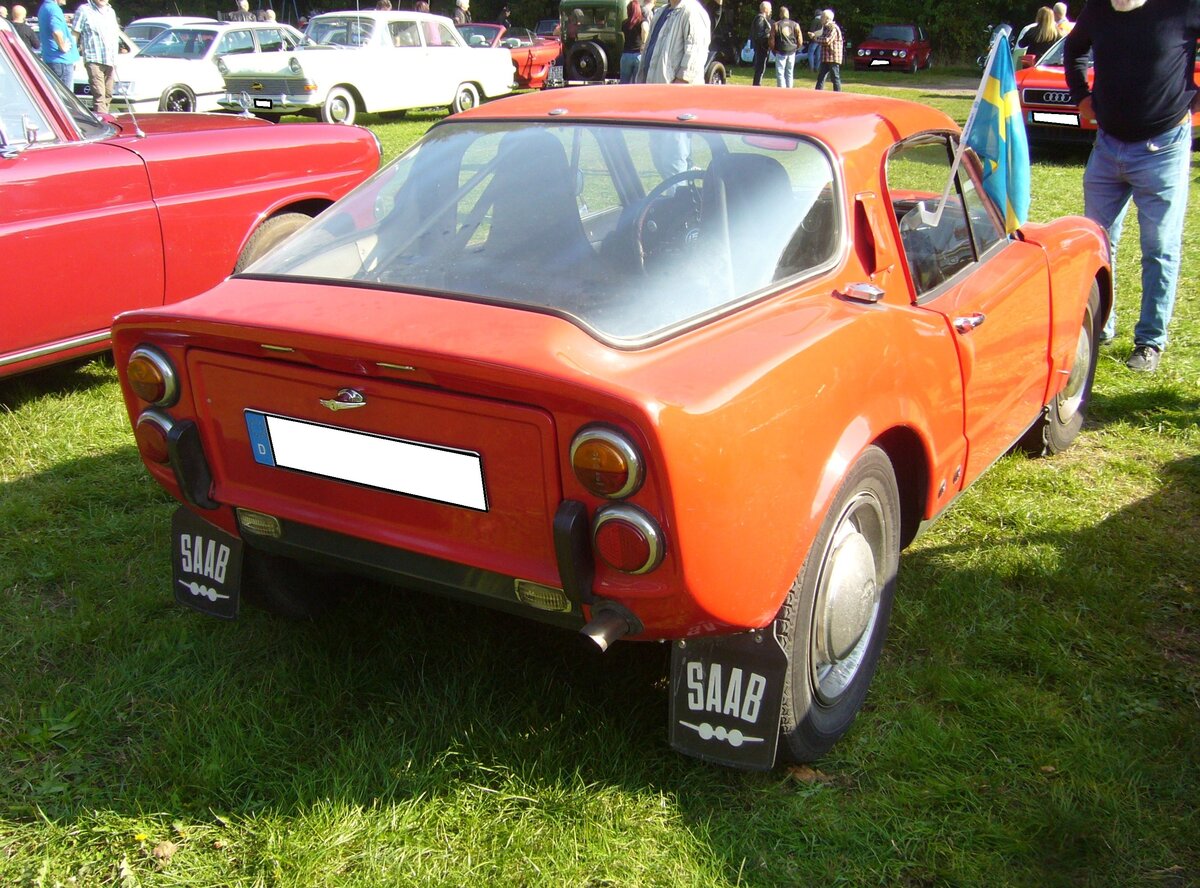 Heckansicht eines Saab 97 Sonett II aus dem Jahr 1967. Oldtimertreffen auf dem Gelände des Bikertreffs Mutter Vogel in Marl am 28.09.2025.