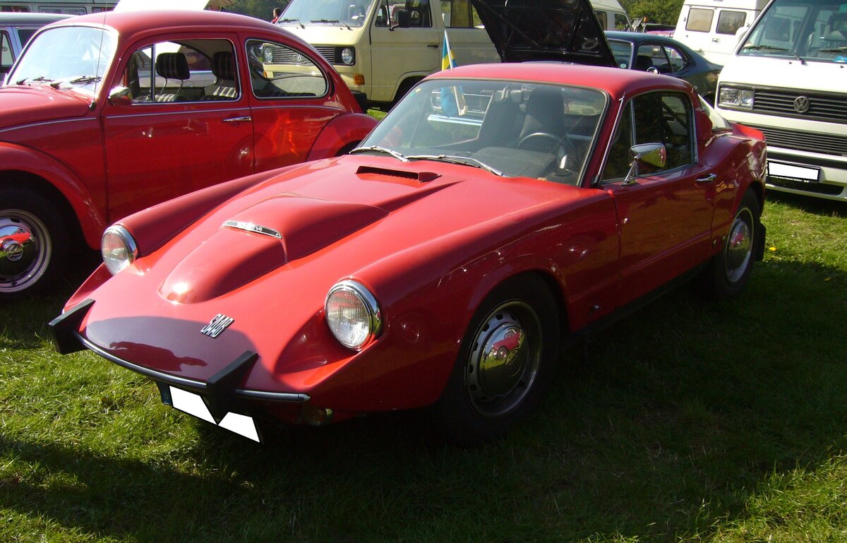 Saab Sonett II aus dem Jahr 1967. Produziert wurde das Modell Sonett II in den Jahren von 1966 bis 1970. Vom werksintern, Modell 97 genannten Sonett II, wurden genau 1868 Fahrzeuge produziert. Die ersten Fahrzeuge waren noch mit dem aus dem Saab 96 bekannten Dreizylinderzweitaktmotor mit 60 PS aus einem Hubraum von 748 cm³ ausgerüstet. Ab Werknummer 259 wurde die Motorisierung auf einen V4-Motor aus dem Hause Ford umgestellt. Dieser Motor hat einen Hubraum von 1498 cm³ und leistet 65 PS. Oldtimertreffen auf dem Gelände des Bikertreffs Mutter Vogel in Marl am 28.09.2025.