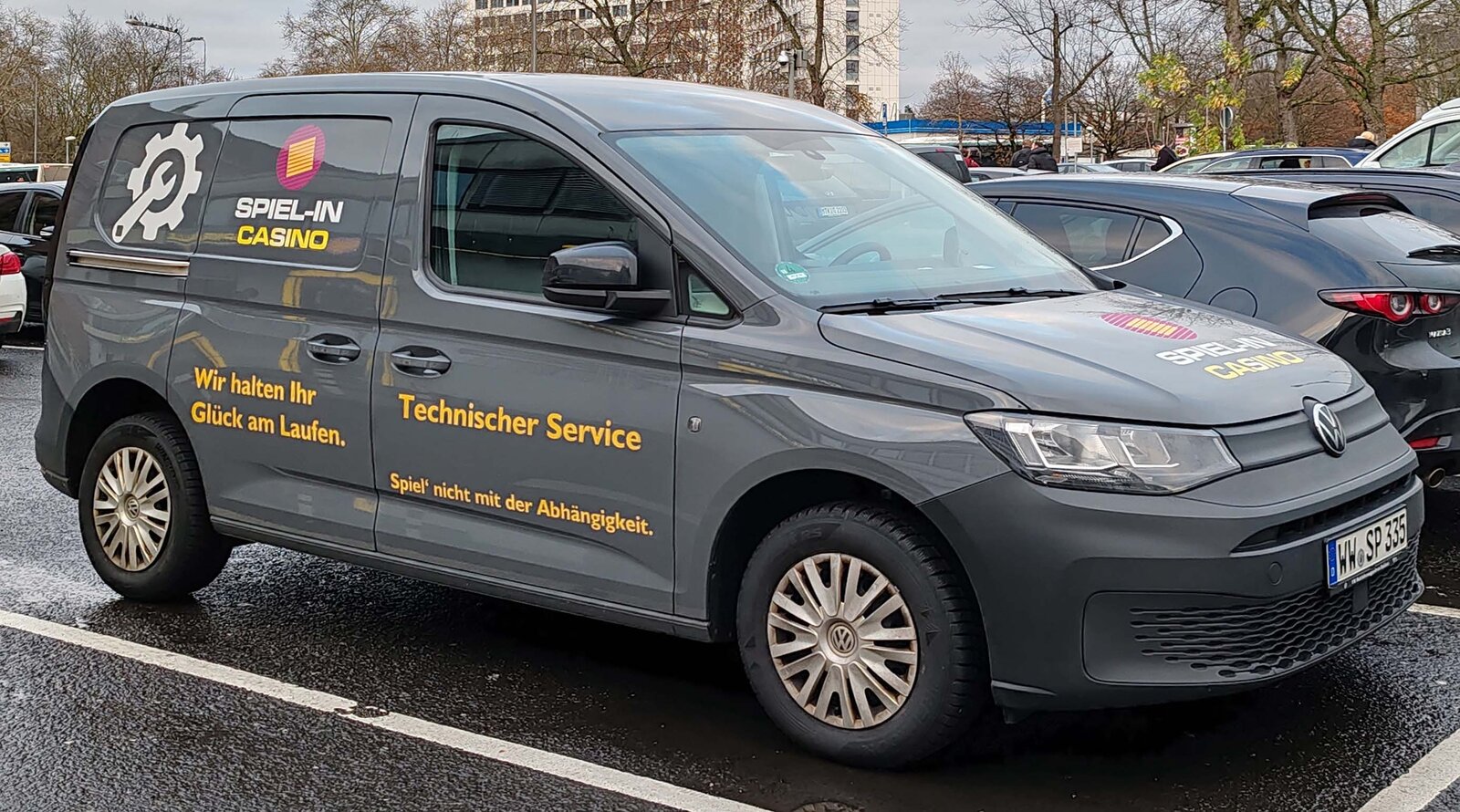 =VW Caddy als Servicefahrzeug von SPIEL-IN CASINO steht am Hbf Wiesbaden im Dezember 2025